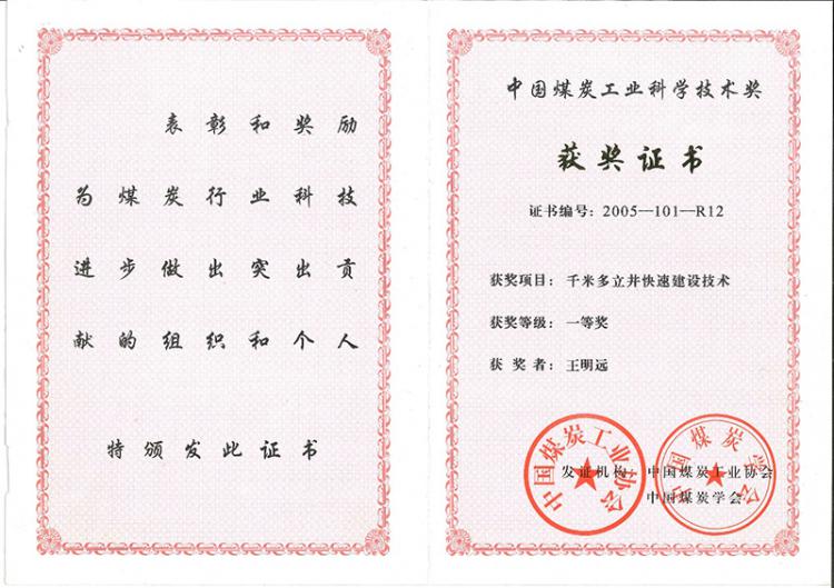 2005年中國煤炭工業(yè)科學(xué)技術(shù)獎一等獎